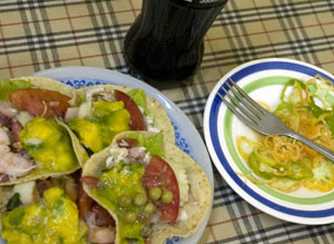 Hmmmm… tacos! When you finally discover real Yucatecan tacos, how can you not fall in love? Don’t you just love those Maya-palm-sized tortillas heaped with a tasty combination of meats or fish or veggies, topped with a spicy salsa, some fresh onions, avocados, tomatoes, cheese or black beans? Pour on a little salsa habanero, roll it into a mini handheld burrito and pop it into your mouth! Four of those is a filling meal, eaten in about ten minutes. Fast food, Yucatán style! Heaven on the tongue!